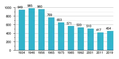 In de eerste volkstelling van 1934 registreerde het dorp 949 inwoners. Dit aantal groeide tot een hoogtepunt van 985 inwoners in 1946. Sindsdien neemt het inwonersaantal af. Op 31 december 2019 telde het dorp 454 inwoners.[1]
