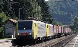 Vier locomotieven in treinschakeling: twee SBB Re 6/6 en twee SBB Re 4/4 II bij Frutigen, Zwitserland, 16 juni 2007. -