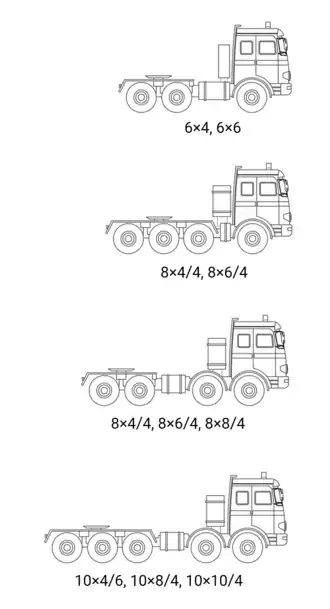 Bij 8×8 en 10x10 trekkers zijn alle assen aangedreven, terwijl de voorste twee zijn meestal beide gestuurd zijn.