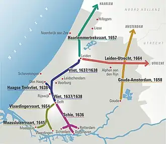 - Leidse Rijn (Utrecht - Harmelen, ±1665). Verder naar het westen nam de rivier de Oude Rijn de functie van trekvaart over.