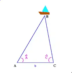 Dit voorbeeld betreft een boot (B) die wordt waargenomen vanaf twee punten A en C op het strand. De onderlinge afstand b is bekend, of kan worden berekend uit de coördinaten van A en C, en zij vormt de basis van een driehoek met de boot als derde punt. De waarnemers in A en C meten elk de hoek die de zichtlijn naar de boot maakt met de basislijn. Met deze drie gegevens kan de positie van de boot in de driehoek worden berekend. De waarnemers kunnen nu ook de lengtes van de twee andere zijden uitrekenen en dus de afstand van elk punt tot de boot.