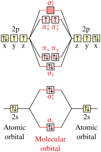 De elektronconfiguratie toont twee ongepaarde elektronen met evenwijdige spin (kwantummechanica). Daarom is dizuurstof reactiever dan distikstof (N2) dat twee elektronen minder heeft, dus dit paar mist. Zuurstofgas gedraagt zich als een biradicaal omdat de twee elektronen met evenwijdige spins anti-bindend zijn in plaats van bindend zoals bij stikstofgas.