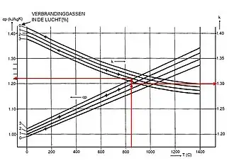 - k of kappa = adiabatische exponent, [dimensieloos]. Deze is afhankelijk van het soort gas dat gecomprimeerd wordt, en van de gemiddelde temperatuur in het expansieproces. De k-waarde is te vinden in handboeken voor gassen en uit een diagram te lezen. Voorbeeld: in bijgaand diagram is af te lezen dat voor lucht met 2% verbrandingsproducten, expanderend van 1200 °C tot 500 °C (gemiddelde temperatuur 850 °C) de k-waarde bedraagt 1,30.