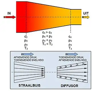 Bij het expansieproces daalt de druk van het stromende hete gas, terwijl de snelheid toeneemt. Het omzetten van druk in snelheid gebeurt in een straalbuis, dat is een convergerend (= toelopend) kanaal. Het principe van de straalbuis berust op de wet van Bernoulli die stelt dat: