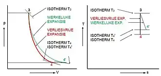 Tijdens het expanderen daalt de druk van de lucht, en wel vanaf de verbrandingskamerdruk p3 tot aan de uitlaatdruk p4. Tevens daalt tijdens de expansie de temperatuur. Dit is in de diagrammen weergegeven door het tekenen van de isothermen voor de turbine-inlaattemperatuur T3 en de turbine-uitlaattemperatuur T4.