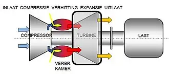 - De arbeid die door elke kg stromend medium op de turbine wordt geleverd is veel groter dan de nuttige arbeid aan de uitgaande as. De turbine moet immers ook nog de compressor aandrijven en die vraagt een aanzienlijke hoeveelheid arbeid per kg lucht.