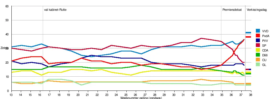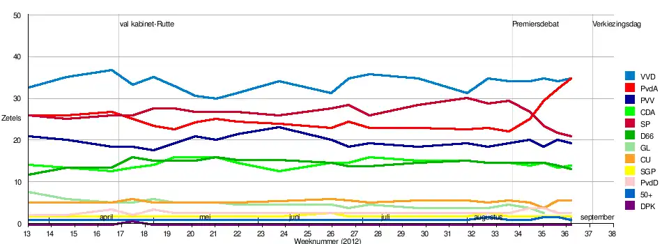 De peilingen voorspelden vóór het premiersdebat bij RTL 4, op 26 augustus 2012, dat de verkiezingen een nek-aan-nekrace zouden worden tussen VVD en SP. Na het premiersdebat veranderden de peilingen en in de laatste week voor de verkiezingen gaven de peilingen aan dat er een nek-aan-nekrace zou optreden tussen VVD en PvdA. Wat betreft het aantal zetels zaten vrijwel alle peilingen er naast.