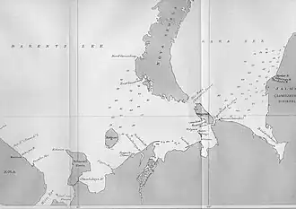 - ↑ Het is duidelijk dat men destijds nog geen idee had van de omstandigheden ter plekke in de winter. Men kende de warme golfstroom niet, die verklaart waarom het klimaat ten westen van Scandinavië veel warmer is dan in de Karazee op dezelfde breedte. 'In summa dat het Menschen vernuft, (soo ment wilde naedencken) t'selfde in gheenderley maniere begrijpen can, ende ons verstant is te swack om Gods wonderen te grondeeren', schreef Van Linschoten hierover. Een theorie was dat kou veroorzaakt werd door het ijs dat zich op land vormde maar, zoals men dacht, niet in open zee. Was men eenmaal ver van land dan zou er geen ijs en een vrije doortocht voor schepen zijn, was de gedachte.