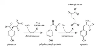 Planten en de meeste micro-organismen synthetiseren L-tyrosine via prefenaat, een tussenproduct van de shikiminezuurroute. Deze stofwisselingsroute is een belangrijke route voor de synthese van aminozuren, co-enzym Q10, tocoferolen, naftochinonen (inclusief de vitamines uit de K-groep), alkaloïden en heterocyclische natuurstoffen. Daarbij wordt uit koolhydraatprecursors shikimaat gevormd en via een reeks enzymatische reacties in chorismaat omgezet. Daarna katalyseert chorismaatmutase de omzetting van chorismaat in prefenaat op het vertakkingspunt bij de biosynthese van aromatische aminozuren zoals tyrosine en fenylalanine. Prefenaat wordt oxidatief gedecarboxyleerd om p-hydroxyfenylpyruvaat te vormen. Hierbij wordt de hydroxylgroep behouden. Vervolgens wordt dit molecuul getransamineerd met behulp van glutamaat als stikstofbron om uiteindelijk tyrosine en α-ketoglutaraat te vormen.