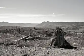 - Kaalslagzone, de binnenste zone met een breedte van 13 km waar praktisch alles, zowel van nature als mensgemaakt, werd vernietigd of weggevoerd.[15] De gloeiende drukgolf met as en meegevoerd materiaal werd niet tegengehouden door de topografie van het terrein, heuvelruggen werden gepasseerd.