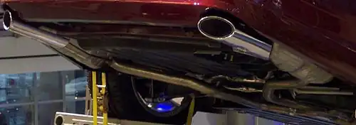De uitlaat is opgehangen aan rubbers, die de trillingen van de uitlaat isoleren van de carrosserie.