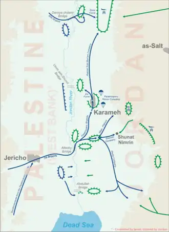 Operatie Assoeta waarin het dorpje Safi werd aangevallen, verliep voorspoedig: zonder verliezen wisten de Israëliërs een veertigtal guerrillastrijders of Jordaanse politieagenten en soldaten te doden en er zevenentwintig gevangen te nemen. Bij Operatie Tofet echter was de strategische verrassing geheel verloren gegaan. Het Jordaanse leger verwachtte de aanval en had zich er goed op voorbereid. De Israëlische hoop dat men alleen symbolisch verzet zou bieden werd niet bewaarheid. Het plan was om met de 7e Pantserbrigade en de 35e Parachutistenbrigade de zuidelijke Allenbybrug over te steken en met de 80e Infanteriebrigade de noordelijke Damiabrug. Beide aanvalsassen zouden daarna een tangbeweging uitvoeren en samen uitkomen bij de grote guerrillabasis van het stadje Karameh. De zuidelijke aanvalsgroep, rond 05:30 overstekend, liep echter al snel vast op een blokkerende positie waarin zich een Jordaans infanteriebataljon had ingegraven. Slecht weer vertraagde het afzetten door helikopters van luchtlandingstroepen die hadden moeten verhinderen dat de Palestijnse troepen naar het oosten zouden ontsnappen; pamfletten met de oproep zich over te geven werden echter wel afgeworpen zodat duizenden strijders — een veel groter aantal dan men verwacht had — gewaarschuwd de heuvels invluchtten, waaronder Jasser Arafat. Tegen acht uur wist men echter door te breken om in Karameh een achtergebleven kern van zo'n vierhonderd strijders te doden of gevangen te nemen. De noordelijke aanvalsas werd succesvol geblokkeerd door de Jordaanse 1e Divisie, terwijl de zuidelijke troepen in de flank hevig aangevallen werden door de Jordaanse 60e Pantserbrigade die echter acht M48 Patton's verloor. Ondertussen lagen de expeditietroepen onder zwaar artillerievuur, terwijl er weinig Israëlische vuursteun was toegewezen en de luchtmacht faalde in het onderdrukken van de Jordaanse batterijen. Een dertigtal Israëlische tanks werd door artillerievuur uitgeschakeld. De meeste werden met grote moeite geborgen, drie door de eigen troepen opgeblazen; één Shermantank brandde uit. Na 170 huizen in Karameh opgeblazen te hebben had men zich rond 20:40 weer over de Jordaan teruggetrokken, ongeveer 150 gevangenen meenemend.