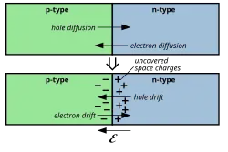 Een uitputtingszone vormt zich doordat de vrije elektronen in het n gedoteerde materiaal zich begeven (diffunderen) naar het p gedoteerde materiaal, waar zij gevraagd zijn; men zegt: de vrije elektronen recombineren met de vrije gaten in het p-materiaal. Het n-materiaal wordt zo positief geladen en het p-materiaal negatief. Het daardoor gevormde elektrische veld werkt de diffusie tegen, zodat een evenwichtssituate ontstaat, die overigens temperatuurafhankelijk is.