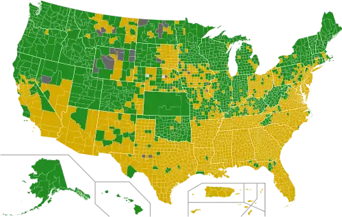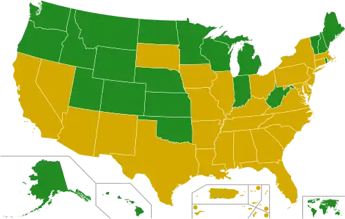 19 staten: AK, CO, HI, ID, IN, KS, ME, MI, MN, NE, NH, OK, RI, UT, VT, WA, WV, WY 1 territorium: DA | |
