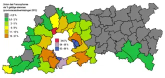 Na de verkiezingen van 2012 daalt het aantal zetels in de provincieraad van 84 naar 72. Hierbij behaalde de UF vijf zetels: drie voor de MR, twee voor het FDF.