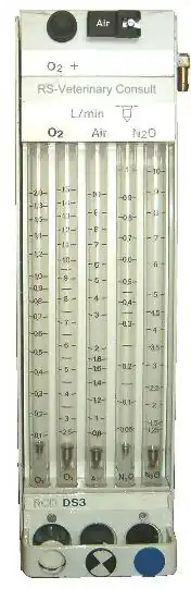 Het afgebeelde blok bevat regelaars en meetbuizen voor zuurstof, lucht en lachgas. De stippellijn is de afleeshoogte op de schaal.