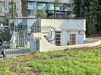Beide gebouwtjes zijn gebouwd als zijnde een souterrain, dus deels onder het maaiveld. Architect Jan de Meijer werkend bij of voor de Dienst der Publieke Werken ontwierp voor deze plek twee toiletgebouwtjes (één voor vrouwen en één voor mannen) met bijbehorende terreinafscheidingen rondom het plantsoen inclusief zitbank. De tijd van aanbesteding was (augustus) 1922, de tijd van de bouwstijl Amsterdamse School. Die bouwstijl is terug te vinden in de symmetrie bij de plek en in de gebouwen zelf. De ingangen bevinden zich tegenover elkaar. Voorts zijn karakteristiek de vloeiende lijnen binnen de bouwconstructie. Dat ze geheel van beton zijn en voorzien van een plat dak wijst minder in die expressionistische richting. De smeedijzeren hekwerken bij de toegangen en het hekwerk rondom zijn dan weer wel binnen de Amsterdamse School.