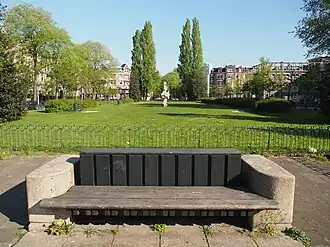 De zitbank in dito stijl bevindt zich aan de zuidzijde van het plantsoen, de De Lairessestraat loopt er langs.