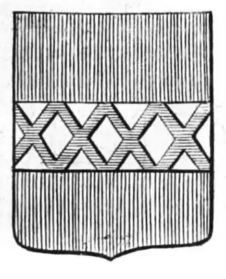 - ↑ Wapenschild van keel met zilveren dwarsbak getralied uit tien stukken van lazuur, in het hoofd vergezeld van drie sterren met zes punten van zilver.