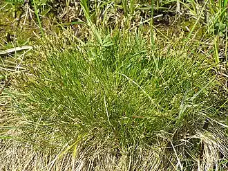 De plant wordt 10-25 cm hoog en is polvormend. De stijf, opgaande, aan de bovenkant ruwe stengels zijn rond tot onduidelijk driekantig. De tot 0,5 mm brede, stomp driekantige bladeren zijn donkergroen, waarvan de onderste, rafelige bladscheden hebben. De bladeren zijn korter dan de stengels en aan de randen ruw. De bladscheden zijn donkerbruin.