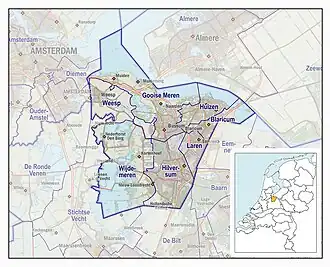 - Gemeenten: Blaricum, Gooise Meren, Hilversum, Huizen, Laren en Wijdemeren