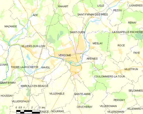 De onderstaande kaart toont de ligging van Vendôme met de belangrijkste infrastructuur en aangrenzende gemeenten.
