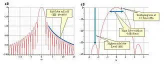 - Scallop loss: de maximale fout in dB die kan voorkomen bij een amplitudemeting. Deze fout treedt op indien de top van de hoofdlobe niet samenvalt met een zichtbare frequentie van de Fouriertransformatie. In het slechtste geval ligt de frequentie van een te meten sinus toevallig net tussen de frequenties van twee opeenvolgende fouriercoëfficiënten. In deze situatie wordt de scallop loss bepaald.
