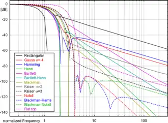 | Venster | Scallop Loss | main lobe width op −3 dB | higest side lobe level | side lobe roll off |