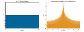 De nevenstaande figuur illustreert de onderstaande uitleg concreet voor een sinus van 5,26 Hz die wordt waargenomen met een rechthoekig venster van 5 seconden. De fouriertransformatie van een oneindig lange sinus bestaat uit één enkele piek op de eigen frequentie. Een wiskundig perfecte sinus bevat immers enkel zijn eigen frequentie. Deze piek, groen op bijgaande figuur, is wiskundig voor te stellen als een Diracfunctie op die precieze frequentie. Wanneer echter (bijvoorbeeld) een rechthoekig venster op de sinus wordt toegepast is de fouriertransformatie, wegens de convolutiestelling de convolutie van de fouriertransformatie van de sinus en de fouriertransformatie van het venster. De convolutie van een Diracfunctie en een andere functie is op zijn beurt een verschuiving van de andere functie tot op de plaats van de Diracfunctie. Dit is een eigenschap van de Diracfunctie. Deze convolutie is de golvende functie in het rood op de figuur. De fouriertransformatie van een sinus, genomen door een rechthoekig venster, is dus een sinc-functie met haar maximum op de frequentie van de sinus (en een tweede sinc-functie op de negatieve frequentie). De fouriertransformatie van een rechthoekig tijdsignaal is immers een sinc-functie in frequentie.