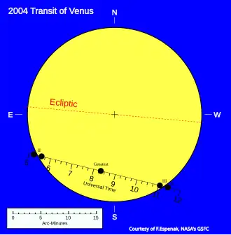 Op dinsdag 8 juni 2004 was in Europa, Azië en Afrika een Venusovergang zichtbaar. De positie van Venus ten opzichte van de zonneschijf is te zien op de afbeelding. De cijfers verwijzen naar de tijd in UTC.
