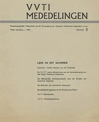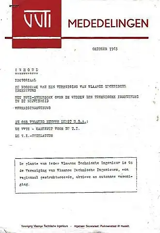 - ↑ De Historiek van de V.V.T.I.?, Wat is de Vereniging van Vlaamse Technische Ingenieurs?, Sekretariaat VVTI, Hasselt, 1964, p.6