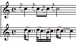 - De hoofdnoot wordt gevolgd door een secunde erboven of onder op een licht maatdeel en wordt weer gevolgd door de hoofdnoot, dit kan meerstemmig optreden, en kan chromatisch zijn. Een triller, pralltriller of mordent is opgebouwd uit hoofdtoon en gewone wisseltoon (de wisseltoon is de bovensecunde of ondersecunde ten opzichte van de hoofdtoon).