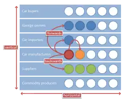 Dit is het proces waarbij het bedrijf beslist tot het zelf ook uitvoeren van een volgende productiefase. Het primaire bedrijfsproces, het oorspronkelijke bedrijfsproces van de productieketen dat het bedrijf uitvoerde, zal worden uitgebreid met een opvolgend productieproces. Dit kan gedaan worden door een al bestaand bedrijf, dat eerst deze taak uitvoerde, over te nemen, of door de benodigdheden voor dit proces aan te schaffen, zodat er geconcurreerd kan worden met de huidige bedrijven die zich begeven op dit productieterrein. Deze vorm van verticale integratie valt in het vijfkrachtenmodel van Michael Porter onder de macht van de leveranciers.