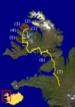 (1) Ísafjörður, (2) Bolungarvík, (3) Suðureyri, (4) Flateyri, (5) Þingeyri, (6) Reykhólar, (7) Búðardalur, (a) Vestfarðargöng