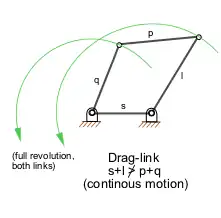 | Voorbeeld van een constructie met een vierstangenmechanisme met twee overeenkomstige ophaalbruggen, links in gesloten stand, rechts in open stand ter illustratie van de beweging. De verticale pilaren ("vaste stang1") dragen een scharnierende bovenbouw ("stang2") met het contragewicht aan de linkerkant en verticale scharnierende stangen ("stang3") aan de rechterkant welke onderaan scharnierend zijn verbonden aan het brugdek ("stang4"). | |