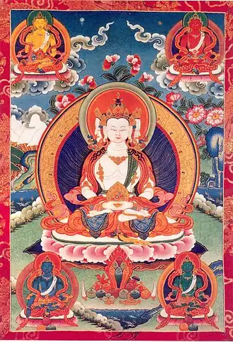 Vairochana behoort tot de Boeddha-familie, Akshobhya tot de Vajra (bliksemflits)-familie, Ratnasambhava tot de Ratna (juweel)-familie, Amitabha tot de Padma (lotus)-familie en Amoghasiddhi tot de Karma (handeling of daad)-familie. Uit de 'principes' van de vijf Boeddha's worden de heruka's en hun gezellinnen gevormd. De heruka's zijn als toornige godheden de omvormingen van de vredige godheden, de Boeddha's en verschijnen in de tweede week na het overlijden aan de overledene in de 'tussenstaat', de (bardo).