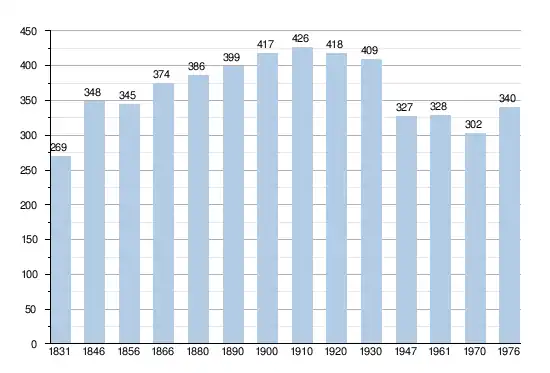 - Bronnen:NIS, Opm:1831 tot en met 1970=volkstellingen, 1976= inwoneraantal op 31 december