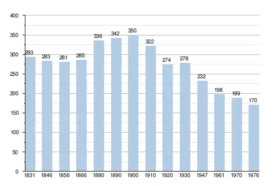 - Bronnen:NIS, Opm:1831 tot en met 1970=volkstellingen, 1976= inwonersaantal op 31 december/small>