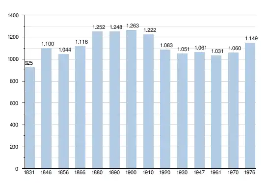 - Bronnen:NIS, Opm:1831 tot en met 1970=volkstellingen, 1976= inwoneraantal op 31 december