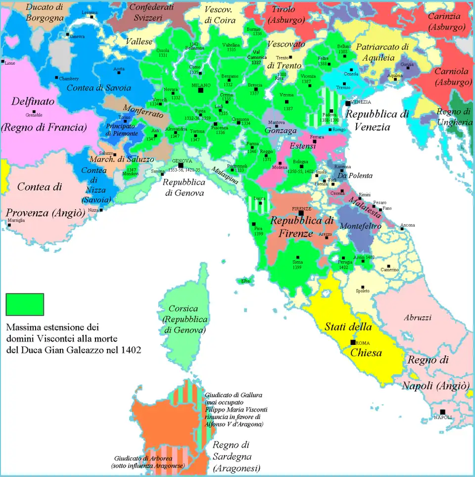 - Gian Galeazzo Visconti (1347-1402) [1385-1402) x Isabella van Frankrijk (1348-1372), xx Blanca van Savoye