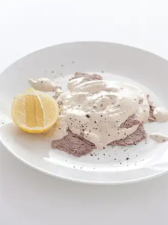 Vitello tonnato is een Italiaans gerecht uit Noord-Italië van in dunne plakken gesneden kalfsvlees bedekt met een romige, mayonaiseachtige saus die gekruid is met tonijn.