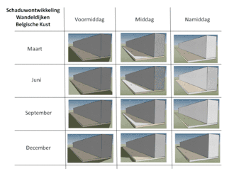 De Belgische kustlijn heeft een oriëntatie van ongeveer 320° (noordwest). De lineaire bebouwing op de wandeldijken is gemiddeld 9 à 10 verdiepingen hoog (ongeveer 30 meter) terwijl de wandeldijken een breedte hebben die iets kleiner is (ongeveer 25 meter). Dit heeft tot gevolg dat voor een groot gedeelte van de dag, tijdens een groot gedeelte van het jaar, de wandeldijken in de schaduw liggen van de lineaire bebouwing, die soms spottend de “Atlantikwall” wordt genoemd, met een knipoog naar de Duitse verdedigingslinie uit de Tweede Wereldoorlog.[5] Achter deze kustlijn verrijzen in verschillende gemeenten nog hogere woontorens: In 1975 was De Mast met 24 verdiepingen nog uniek in Oostende, maar sedert 2020 zijn daar projecten bijgekomen als “The Waves” en “Sky Towers”.[6]