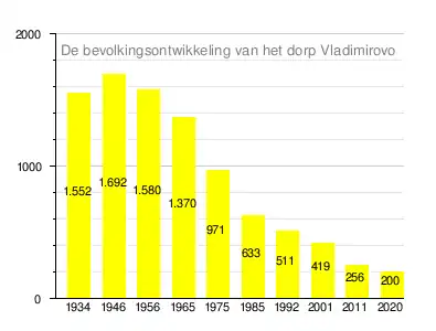 Het dorp Vladimirovo heeft te kampen met een intensieve bevolkingskrimp. Tussen december 1934 en december 1946 is het inwonersaantal van 1.552 inwoners gestegen tot een maximum van 1.692 personen. Sindsdien is het inwonersaantal continu afgenomen. Eind 2020 woonden er 200 personen in het dorp.[1][2]