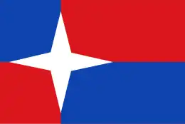 In de broeking twee banen van gelijke hoogte in blauw en rood, het uitwaaiende deel twee banen van gelijke hoogte in rood en blauw, met op de scheiding van broeking en vlucht een vierpuntige ster in wit ter hoogte van 4/5 van de hoogte van de vlag.