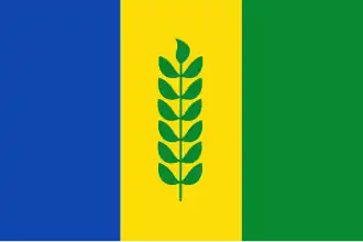 Drie verticale banen van gelijke breedte in de kleuren blauw-geel-groen, waarbij in de gele baan het gemeentewapen is afgebeeld.