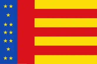 Zeven banen van geel, rood, geel, rood, geel, rood en geel, met een broeking van twee even lange banen van blauw en rood; beladen met 12 vijfpuntige sterren van geel, geplaatst in 2, 1, 2, 2, 2, 1 en 2.