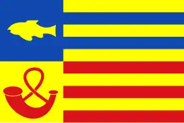 Een broeking van blauw en geel, met op het blauw een gele vis, en op het geel een rode hoorn met band; en een vlucht van 10 banen geel-blauw-geel-blauw-geel-rood-geel-rood-geel-rood.