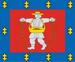 Het regionale embleem in het midden van de vlag is rood veld een zilveren boerenzaaier met een gouden hoed, met dezelfde zeef en korrels, die hij met uitgestrekte handen aan beide kanten uitstrooit.