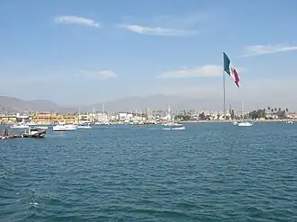 De vlag van Mexico is een driekleur met vanaf de hijszijde naar het uiteinde de kleuren groen, wit en rood; in de middelste baan staat het wapen van Mexico. Ook van achteren gezien bevindt de groene baan zich aan de hijszijde en kijkt de adelaar richting de stok.