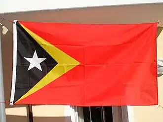 ? Vlag van Oost-Timor in de verhouding 2:3, zoals die al in 1975 werd gebruiktNa de Anjerrevolutie in Portugal werden ook in Portugees Timor partijen toegestaan. De dominante, linkse partij in Oost-Timor, het Frente Revolucionária de Timor-Leste Independente (FRETILIN), gebruikte dezelfde kleuren als de BLLT in haar partijvlag en ook de witte ster op een zwarte achtergrond. Afgezien van hun politieke oriëntatie zijn er geen banden tussen de twee organisaties. Het is niet duidelijk in hoeverre de vlag als model diende of dat er gewoon gebruik werd gemaakt van veelgebruikte socialistische symbolen zoals de vijfpuntige ster en de kleur rood op de partijvlag. Volgens de legende ontwierp verzetsstrijder Natalino Leitão de huidige nationale vlag op basis van de FRETILIN-vlag in de nacht voordat Portugal op 28 november 1975 de onafhankelijkheid uitriep. De beginnende bezetting van het land door Indonesië had de FRETILIN in het nauw gebracht. Tegenwoordig is 28 november de feestdag van Oost-Timor, waarop officiële gebouwen worden gevlagd. Slechts negen dagen na de onafhankelijkheidsverklaring begon Indonesië openlijk met de invasie van Oost-Timor. Natalino Leitão werd daarbij gedood.